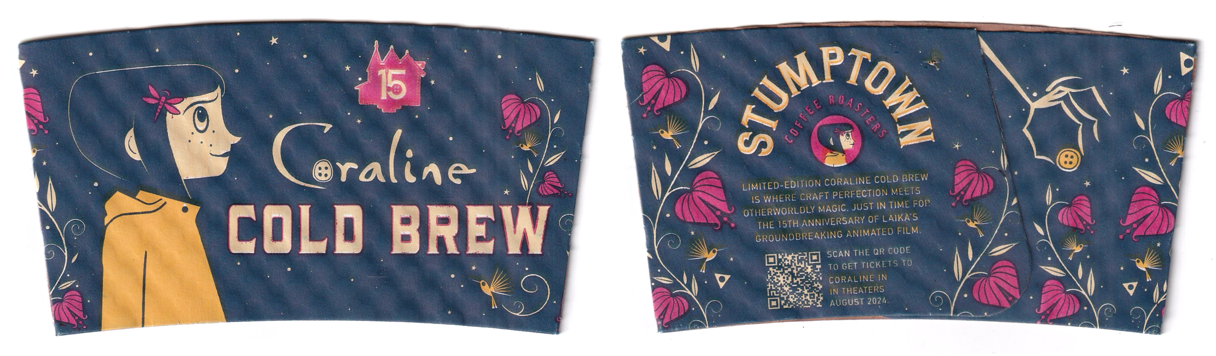 The first company, Good Start Packaging, sent me a box (of mostly tissue paper) with four sleeves from their previous client work, plus two Your-Logo-Here generics with some (honestly really helpful if I was actually ordering customs from them) specs and font size recommendations printed on them. I was actually so thrilled that the samples they sent me are from real businesses they worked with - while I have a bit of homework to do on the very vague Aria sleeve to determine where it’s actually from, it’s crazy that I was able to get such nice sleeves so easily and at no cost. The Coraline one from the collaboration with Stumptown Coffee Roasters in particular is just, for lack of better words, fucking awesome. Also, the sleeve for the Nest Kitchen & Cafe is from a cafe in New Hampshire that appears to no longer be in business, so I literally could not have gotten it anywhere else (unless someone randomly hoarded one and happens to find out about me and sends it to me, which seems crazy).