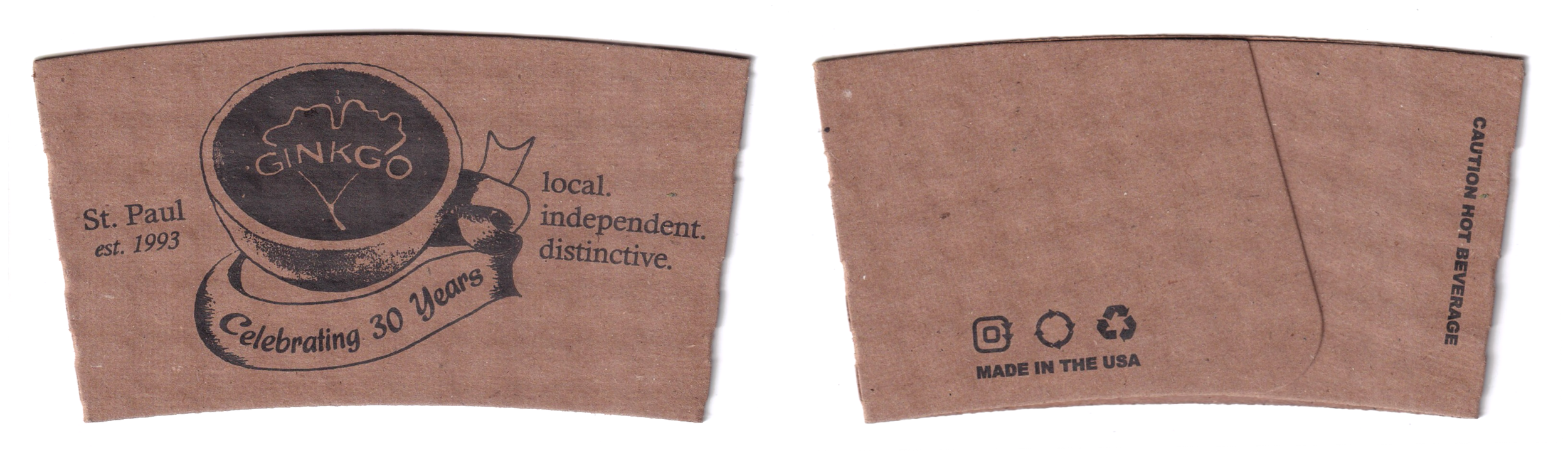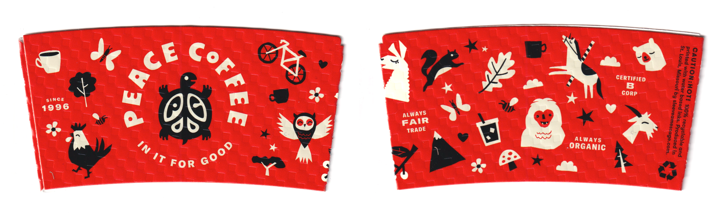 Peace Coffee does not operate their own cafes, but their roastery is in Minneapolis and their products are available in several stores and restaurants around Minnesota. These sleeves can be found at various places that serve their coffee, so I’m not sure where this one was originally picked up. I have linked the roasting company instead.